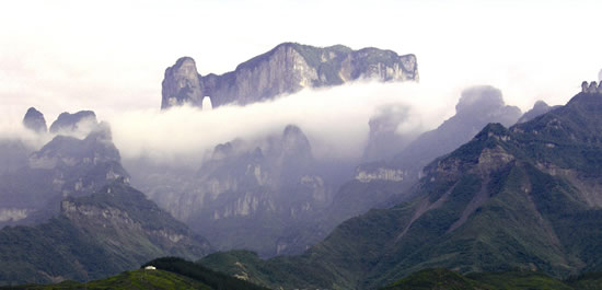 六十八平方公里的山體綿延,卻只有兩平方公里的山頂突起,遠(yuǎn)看如畫(huà)屏護(hù)城,近看為“仙”字鼎立,靜黑的石壁,懸崖上散碎的樹(shù)叢,典型的喀斯特地貌讓天門山猶如一副天成的水墨畫(huà)。加上獨(dú)特的地勢(shì),一年里幾乎三分之二的時(shí)間,天門山都是云氣飄蕩,這就更為這副巨大的山水畫(huà)增添了幾分空靈的韻味。