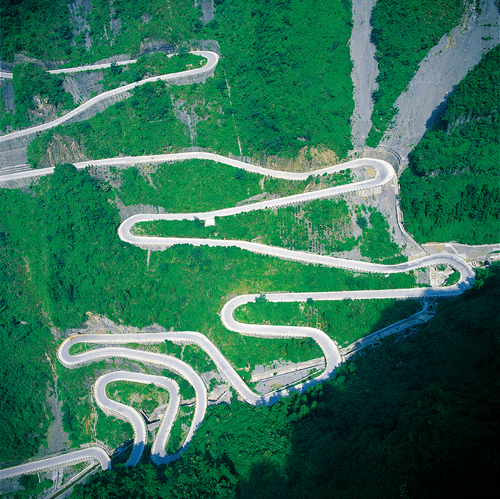 天門(mén)山國(guó)家森林公園位于張家界市區(qū)南郊,其核心景點(diǎn)通天大道歷時(shí)8年修建,公路自天門(mén)山山門(mén)廣場(chǎng)始,至天門(mén)洞止,公路共有99個(gè)彎道,180度的彎路環(huán)環(huán)相連、層層迭起,氣勢(shì)雄偉。建設(shè)公路過(guò)程中又為減少植被破壞,整個(gè)工程充滿(mǎn)著艱辛卓絕,以蜿蜒迂回穿行于山體絕壁之天險(xiǎn)而成為天下第一公路奇觀。中國(guó)書(shū)法家協(xié)會(huì)名譽(yù)主席沈鵬先生走過(guò)通天大道后欣然為其題字“曲道通天”,字體遒勁挺拔,與通天大道的奇絕天下相融為一體。