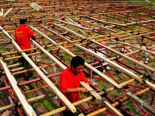 2008中國湖南國際旅游節(jié)已經(jīng)進入倒計時,作為本次活動重頭戲的開幕式演出節(jié)目正在進行緊張的排練,而備受關(guān)注的開幕式舞臺工程到底建設(shè)進度如何?8月13日,據(jù)承建單位張家界喜洋洋文化傳播有限公司工作人員介紹,開幕式舞臺工程已完成1/3,現(xiàn)正進行第二表演區(qū)的鋼管搭建和木板鋪設(shè),其它各項工程進展順利,能在8月25日如期接受組委會驗收。