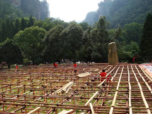 2008中國湖南國際旅游節(jié)開幕式舞臺位于世界自然遺產(chǎn)張家界國家森林公園老磨灣,根據(jù)導(dǎo)演組的舞臺美術(shù)設(shè)計,分為主體演出舞臺和方陣舞臺,總面積1600多平方米,總共將容納1600人同臺演出。其中主體舞臺長40米、深度為31.5米、高1.5米,方陣舞臺為42米長、深度9.5米、最高達10.5米的弧型階梯式舞臺。整個工程共需要使用25噸左右的鋼管,舞臺表面每平方米能夠承重600公斤以上。