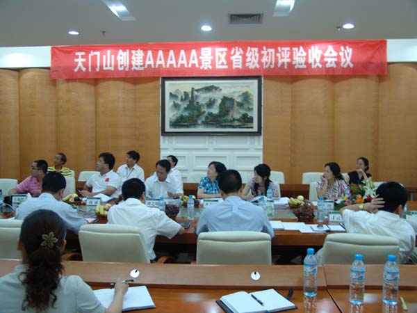 8月12日上午,天門山創(chuàng)建AAAAA景區(qū)省級初評驗(yàn)收會議在天門山索道下站會議室召開。省旅游局副局長劉之明,省旅游局規(guī)劃處處長尚斌,省旅游局規(guī)劃財務(wù)處處長李志斌,省旅游局規(guī)劃財務(wù)處副處長黃可,省旅游局規(guī)劃財務(wù)處副主任科員王朝暉以及衡陽市旅游局規(guī)劃科科長王玲代表省評定組出席了會議。張家界市副市長肖凌之,張家界永定區(qū)區(qū)長陳競,張家界永定區(qū)副區(qū)長張?jiān)诜澹瑥埣医缡新糜尉志珠L丁云勇,張家界市旅游局副局長谷中元,張家界區(qū)旅游局局長吳文斌等張家界市區(qū)相關(guān)領(lǐng)導(dǎo)也出席了會議。