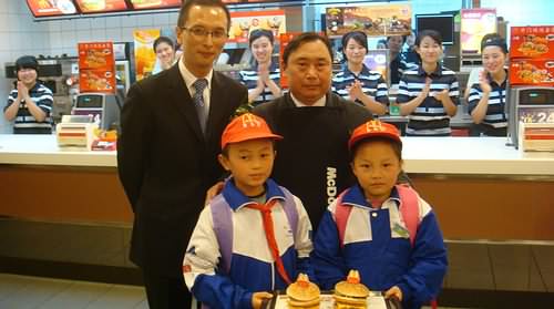 張家界市人大副主任王海生(后排右一)在麥當勞湖南、武漢、浙江市場營運總監(jiān)李輝的陪同下,親自制作了張家界解放路麥當勞餐廳的第一個巨無霸漢堡,并贈送給當地家庭貧困的孩子們。