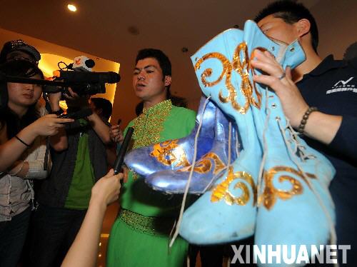 4月24日,新疆“達(dá)瓦孜”傳人賽買提·艾山在新聞發(fā)布會上接受采訪。當(dāng)日,賽買提·艾山在新聞發(fā)布會上宣布,他將于25日在張家界天門山景區(qū)再次進(jìn)行高空大斜度走鋼絲極限挑戰(zhàn)。今年24歲的賽買提·艾山是新疆“達(dá)瓦孜”第七代傳人,已經(jīng)創(chuàng)造了高空鋼絲倒立時間最長、倒走距離最長以及坡度最陡三項吉尼斯世界紀(jì)錄。 新華社記者龍弘濤攝