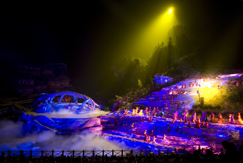 世界第一臺(tái)大型山水實(shí)景音樂(lè)劇《新劉?抽浴吩趶埣医缣扉T(mén)山試演。9月13日晚,參加2009湖南國(guó)際旅游節(jié)的國(guó)內(nèi)外嘉賓、領(lǐng)導(dǎo)和媒體記者近3000人共同見(jiàn)證這一輝煌時(shí)刻。