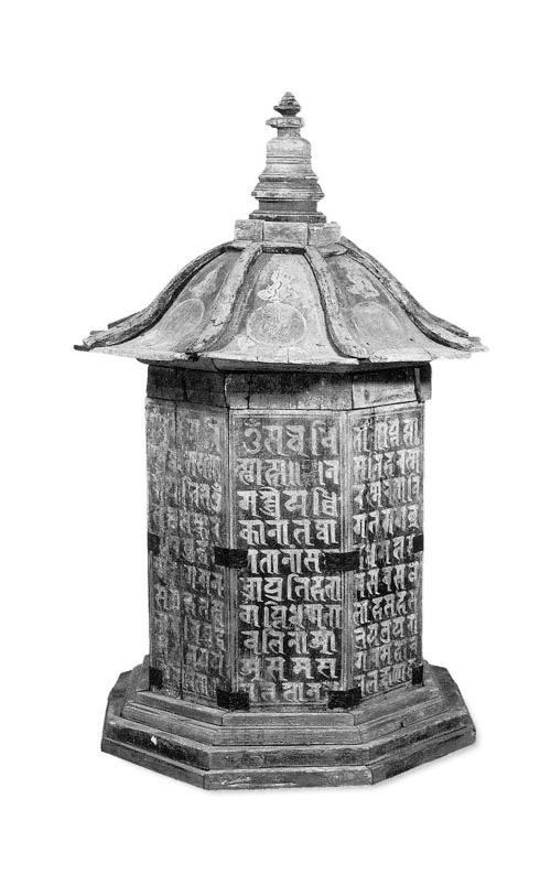 西夏木緣塔為西夏墓葬中第一次發(fā)現(xiàn)的西夏葬器。該塔通高75厘米,塔頂邊沿寬47厘米,呈四層八角形,飾紅色;分塔座、塔身、塔頂和塔剎四部分。塔座為四級八邊臺階。塔身為八邊柱體形,由長34厘米、寬12.5厘米、厚2厘米的八塊木板合成,表面涂藍色,每邊有黃色工整梵文“陀羅尼”,并用漢文注明陀羅尼經(jīng)名。塔頂為傘式八邊形,每邊彩繪云氣紋和一個梵文字,內(nèi)有墨書“故考任西經(jīng)略司都案劉德仁,壽六旬有八,于天慶五年歲次戊午四月十六日亡歿,至天慶七年歲次庚辰(申)口夏十五日建緣塔,至中秋十三日入課訖”。塔剎圍欄為八邊形,其他相輪、覆缽、剎頂都是圓形,由下向上收分;底座周圍繪有卷草紋。