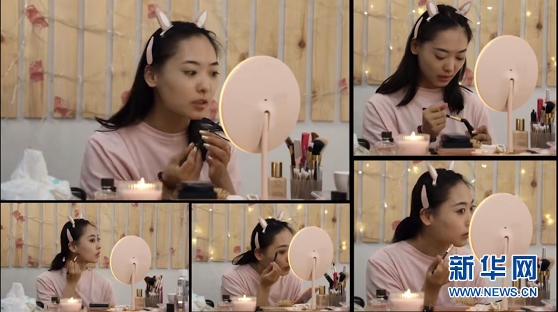 化妝鏡、美妝工具、閃爍的背景燈,在臨時(shí)搭建的“直播間”里,班銳開(kāi)工了。