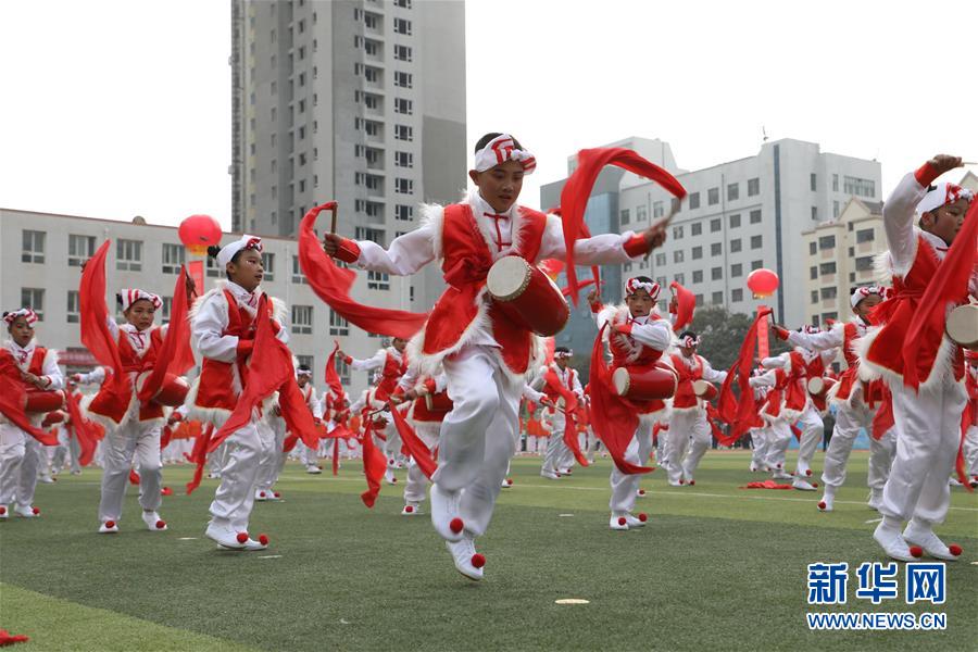 11月4日,蘭州市桃樹(shù)坪小學(xué)學(xué)生在活動(dòng)現(xiàn)場(chǎng)表演歡慶腰鼓。當(dāng)日,甘肅省蘭州市城關(guān)區(qū)學(xué)校體育“一校一品”現(xiàn)場(chǎng)展示活動(dòng)在蘭州市第五十四中學(xué)舉行,16所學(xué)校進(jìn)行了特色校園體育項(xiàng)目表演。據(jù)介紹,蘭州市城關(guān)區(qū)現(xiàn)已推廣各類(lèi)體育項(xiàng)目40余項(xiàng),命名“體育特色項(xiàng)目示范校”42所。 新華社記者 張智敏 攝