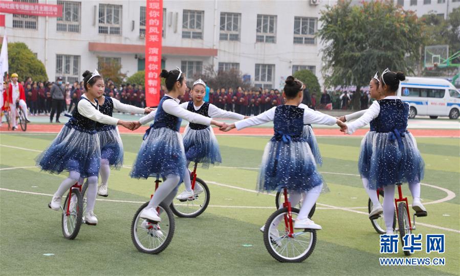 11月4日,蘭州市伏龍坪小學(xué)學(xué)生在活動(dòng)現(xiàn)場(chǎng)進(jìn)行獨(dú)輪車(chē)表演。新華社記者 張智敏 攝