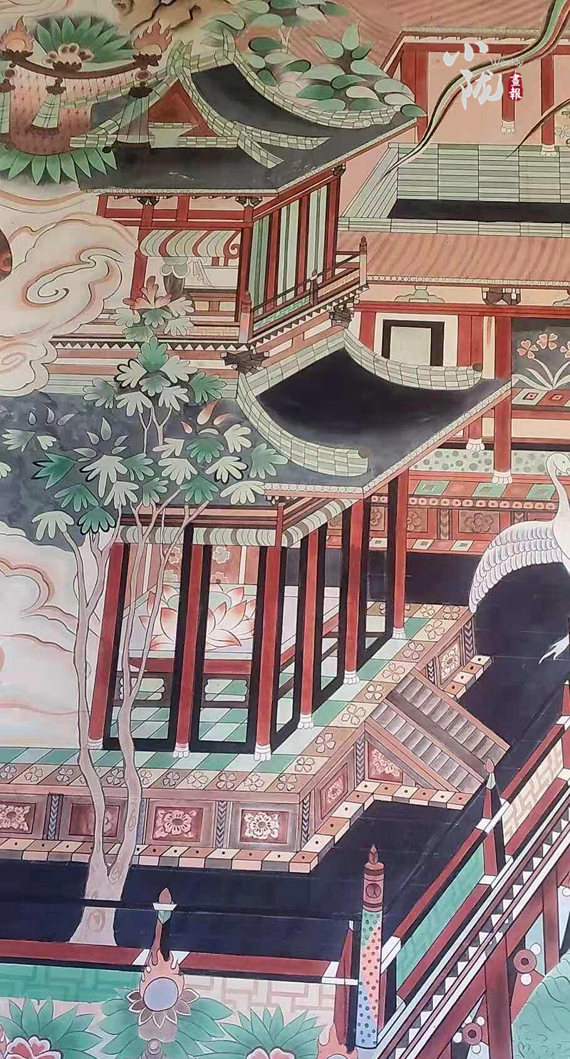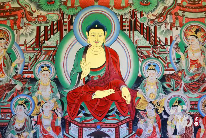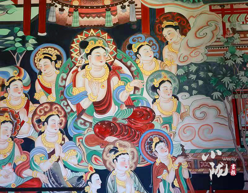 該壁畫是按照敦煌莫高窟第220窟唐代《無量壽經(jīng)變》壁畫為原型,選址鳩摩羅什寺旃檀佛殿正面墻體,由敦煌畫院畫師張杰龍臨摹再創(chuàng)作,融入了敦煌莫高窟唐代112窟壁畫局部經(jīng)變內(nèi)容,與原作既有相似,但又不完全是原作。