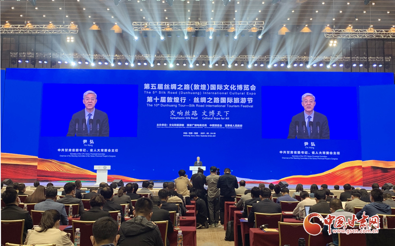 中國甘肅網(wǎng)9月24日訊(本網(wǎng)記者  宋芳科 楊亞楠 張振國)9月24日上午,第五屆絲綢之路(敦煌)國際文化博覽會和第十屆敦煌行·絲綢之路國際旅游節(jié)開幕。本屆“一會一節(jié)”由文化和旅游部、國家廣播電視總局、中國國際貿(mào)易促進委員會、甘肅省人民政府共同主辦,以“交響絲路 文博天下”為主題,旨在進一步加強“一帶一路”人文交流的官方合作和民間往來,增進共建“一帶一路”國家的文化認同。中共中央政治局委員、中央書記處書記、中宣部部長黃坤明以視頻方式發(fā)表主旨演講。