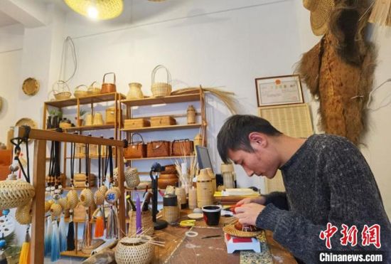 圖為承襲祖輩竹編手藝的“90后”張照杰正忙著趕制一件“私人訂制”的竹編手工品。 馮志軍 攝