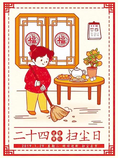 據(jù)《呂氏春秋》記載,這一風(fēng)俗源于堯舜時(shí)代。臘月二十四那天,隴上人家就陸續(xù)開(kāi)始打掃起來(lái),全家老少一起動(dòng)手,清掃房屋積塵,石灰刷墻,新紙裱糊仰塵,擦洗窗欞,糊上新窗紙,貼窗花或貼“窗孔子”(微型花鳥(niǎo)畫與書(shū)法),擦拭箱柜上的銅什件、器皿污垢,打氈抖土,拆洗被褥。一番流汗勞碌,居室煥然一新,過(guò)年的心情也更加舒暢。