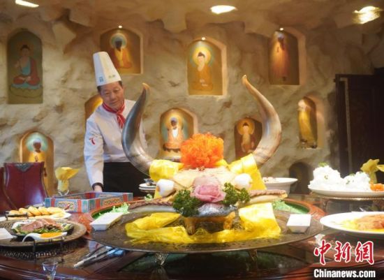 中新網(wǎng)蘭州3月29日電(張婧)“來自壁畫中的敦煌菜,背后都藏著真實(shí)存在的人或事、景或點(diǎn)。”國家特一級(jí)烹調(diào)師趙長安長期從事于敦煌菜的歸納與發(fā)展。他說,無論菜名還是菜式的賣相,都融入敦煌故事或圣境圣水,可謂“一菜一典故,一席十圣境”,讓人仿佛置身于古絲綢之路上。