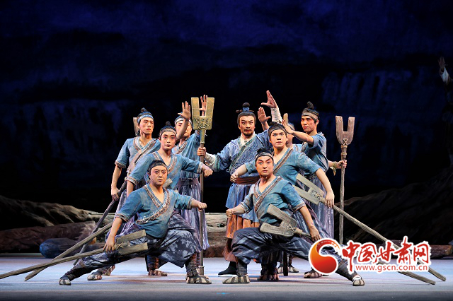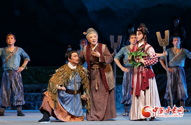 隴劇《大禹治水》是在甘肅省文化和旅游廳全程指導(dǎo)下,《黃河流域生態(tài)保護(hù)和高質(zhì)量發(fā)展規(guī)劃綱要》出臺(tái)之際,甘肅文藝工作者挖掘黃河文化蘊(yùn)含的時(shí)代價(jià)值,講好“黃河故事”,實(shí)施隴原文藝高峰攀登工程、加強(qiáng)非物質(zhì)文化遺產(chǎn)保護(hù)傳承的具體行動(dòng)。該劇將“大禹”這個(gè)上古英雄請(qǐng)下神壇,為他賦予了親情、愛情、家國情懷,在兩個(gè)小時(shí)的演出中,領(lǐng)銜出演“大禹”的優(yōu)秀青年演員邵炳德與雷通霞、竇鳳霞、佟紅梅等“三朵梅花”同臺(tái)飆戲,火花四濺的“開山”、扣人心弦“治水”,將大禹和先民們不畏艱險(xiǎn)、篳路藍(lán)縷的開拓精神和奮斗精神,演繹得淋漓盡致,深深震撼著現(xiàn)場觀眾。而隴劇音樂獨(dú)有的“麻簧”、以皮影戲?yàn)楸憩F(xiàn)手法的“月下婚禮”場景、水袖舞場景,把人物的情緒表現(xiàn)得栩栩如生,將獨(dú)具特色的隴劇藝術(shù)盡情綻放在舞臺(tái)之上。