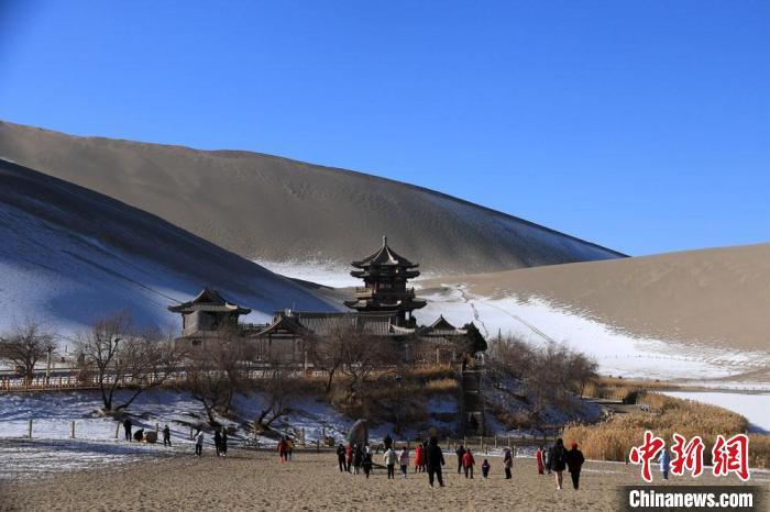 1月23日,游客在甘肅敦煌市鳴沙山月牙泉景區(qū)游覽。張曉亮 攝