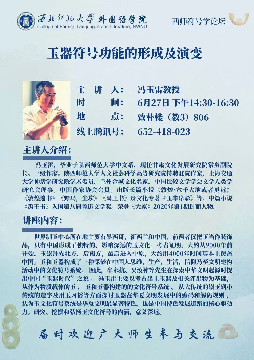 由甘肅文化發(fā)展研究院常務(wù)副院長(zhǎng)、一級(jí)作家馮玉雷主講的《玉器符號(hào)功能的形成及演變》將于6月27日下午在西北師范大學(xué)舉辦。此項(xiàng)活動(dòng)是西北師范大學(xué)外國(guó)語(yǔ)學(xué)院西師符號(hào)學(xué)論壇系列講座之一,旨在促進(jìn)玉文化與符號(hào)學(xué)的融合研究。
