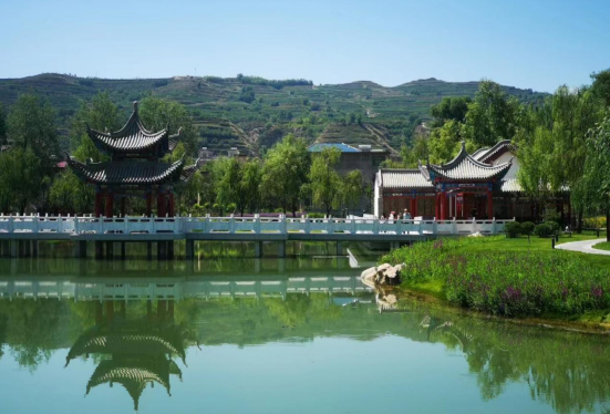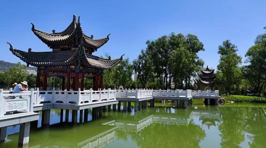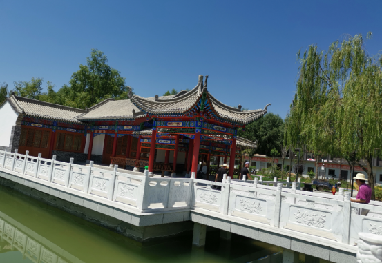 為景點(diǎn)命名。綜合考察廣河歷史文化遺存,細(xì)致視察公園營造之特色,遂將其命名為大夏公園,并結(jié)合園內(nèi)景點(diǎn)布局、建筑特色、用途等,為亭、榭、湖、軒、橋等景點(diǎn)命名,如齊家亭、半山亭、天保廊、鐘鼎山房等。最讓人心曠神怡處,當(dāng)為波光粼粼的湖面,因形狀頗似如意,故命名為如意湖,而分東西橫臥在湖面最狹窄處的兩座握橋,分別命名金龍橋、玉鳳橋。