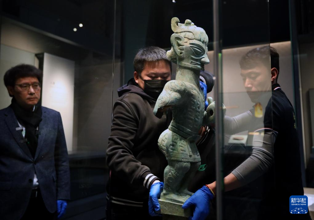 1月29日,工作人員將豎披發(fā)青銅人像移入展柜。