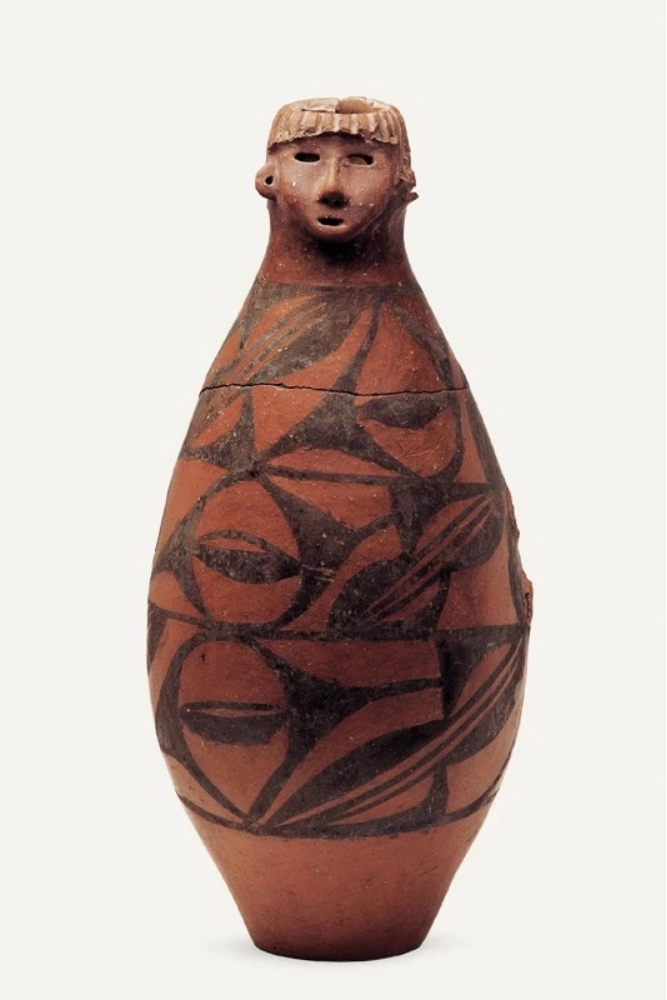 隴東少女作為甘肅的“顯眼包”之一,是曾在《國(guó)家寶藏》中出現(xiàn)過(guò)的“網(wǎng)紅”、甘肅省博物館鎮(zhèn)館之寶,它于1973年從秦安縣大地灣遺址出土。具有高度審美能力的“托尼”老師,設(shè)計(jì)了齊劉海發(fā)型,顯得很泰酷辣,圓鼓腹、平底,人們細(xì)看發(fā)現(xiàn),陶人的兩眼為圓孔洞,顯得目光深邃;鼻子呈蒜頭形,雕有鼻孔;嘴較小,微微張開,好像正在言語(yǔ);兩耳外展,皆有穿孔;瓶體從上至下以黑彩飾三層大小相同、由弧線三角紋和斜線組成的二方連續(xù)圖案,以示華麗的衣物。另外,陶瓶人頭像的器口運(yùn)用了不同的制作手法,頭發(fā)、嘴系雕刻而成,鼻、臉是捏塑而成。人頭像五官整齊、面龐秀麗,器身造型典雅,與人物形象渾然一體,既是大地灣文化彩陶的代表作,也是中國(guó)史前集彩繪、雕塑與造型藝術(shù)于一身的杰作。估計(jì)任誰(shuí)看一眼,都會(huì)被“她”的神秘和美麗所吸引吧。