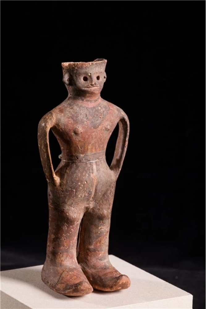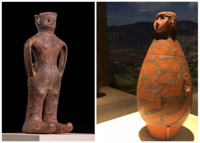隴東有少女,而位于河西的玉門火燒溝同樣出土了一件距今3700多年的人形彩陶罐,被人們稱做“河西少年”。在2019年“少女”與“少年”這一對(duì)“金童玉女”就已經(jīng)邂逅了,2019年中國(guó)國(guó)家博物館展出“絲路孔道——甘肅文物精華展”時(shí),在展覽序廳門口了生了這樣一場(chǎng)友愛的“接力”。隴東大地灣的可愛“少女”——人頭形器口彩陶瓶說(shuō):“出來(lái)有一陣子了,在京城過(guò)了端午節(jié),該回家了!在京的時(shí)間雖短,但我很高興作為代表在國(guó)家博物館迎接全國(guó)、全世界的觀眾,希望還有機(jī)會(huì)可以再來(lái)!”。河西火燒溝的酷“少年”——人形彩陶罐說(shuō):“您回家了,我接替您的工作,在展覽的大門口,繼續(xù)帶領(lǐng)觀眾領(lǐng)略多彩厚重的甘肅歷史文明!”