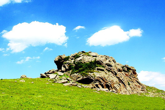 秦人遠去了,只留下那些讓后人至今懷想不已的地名,諸如石鼓山、景墩梁、牧馬梁、上店子、下店子、大卜峪、瓦泉峪等,而尤以石鼓山最為著名,著名得連那部白發(fā)三千丈的《水經(jīng)注》里,都記載著它的故事:“山在梧中聚,有石鼓不擊自鳴,鳴則兵起。漢成帝鴻嘉三年,天水冀南山有大石自鳴,聲隱隱如雷,有頃止,聞于平襄二百四十里,野雞皆鳴。石長丈三尺,廣厚略等,在崖勒,去地百余丈,民俗名曰石鼓。”石鼓山是朱圉山最高峰,海拔2625米,山峰陡峭,人跡罕至,遠望如石鼓,近看似臥牛,茂林幽泉,森秀無比。初春時節(jié),萬物透綠而石鼓白雪皚皚;大雨前夕,飛鳥翱翔而山上煙云彌漫。更為神奇的是,山丘之巔,突兀一石,酷似一頭臥北朝南的耕牛,翹首做犀牛望月之狀,人稱臥牛山。臥牛山石頸之下,有一巨石,其面圓而平,每當(dāng)正午陽光直射之時,遠遠望去,石面宛如獸皮所蒙,恰如一面威風(fēng)凜凜的巨型戰(zhàn)鼓,恍惚之中,有如雷聲隱隱而來,民呼之曰石鼓,石鼓山因此得名。石鼓山素來以厚重的人文歷史和優(yōu)美的草原風(fēng)光而著稱,尤為聞名的“石鼓擎雪”,自古就是“甘谷八景”之一。千百年來,石鼓山甘愿舍棄繁華,遠離人世,在淡泊寧靜的歲月中,固執(zhí)而堅定地守望古坡,守望古坡人家。