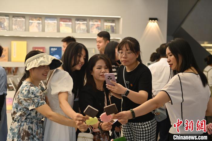 6月19日,甘肅省博物館藝術(shù)生活館在甘肅蘭州開館。該館是甘肅省博物館打造的一處復(fù)合型高價值文化空間,融合了咖啡、烘焙、展覽、藝術(shù)書店、文創(chuàng)銷售等多樣化業(yè)態(tài)。圖為顧客與自己挑選的蘭州凍梨文創(chuàng)玩偶合影。中新社記者 李亞龍 攝