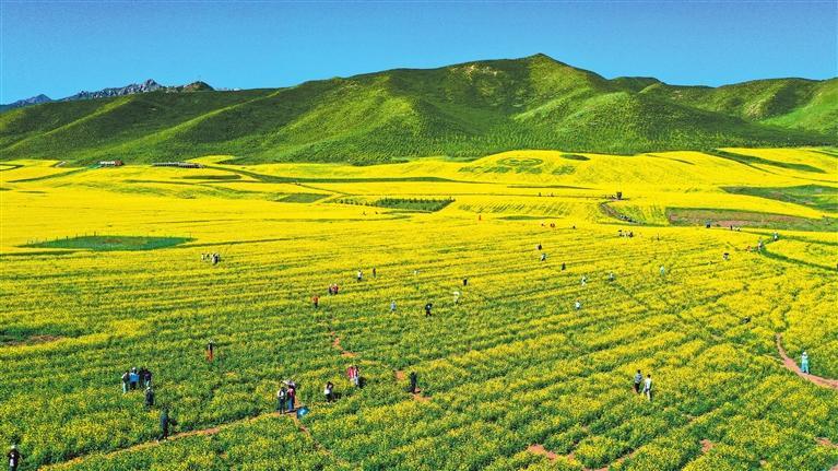 萬畝油菜花海在山間盡情綻放,錯落有致的梯田綿延起伏,遠處白墻黛瓦的村落在金色的田地中若隱若現(xiàn),那里便是坐落在扁都口外的炒面莊村。