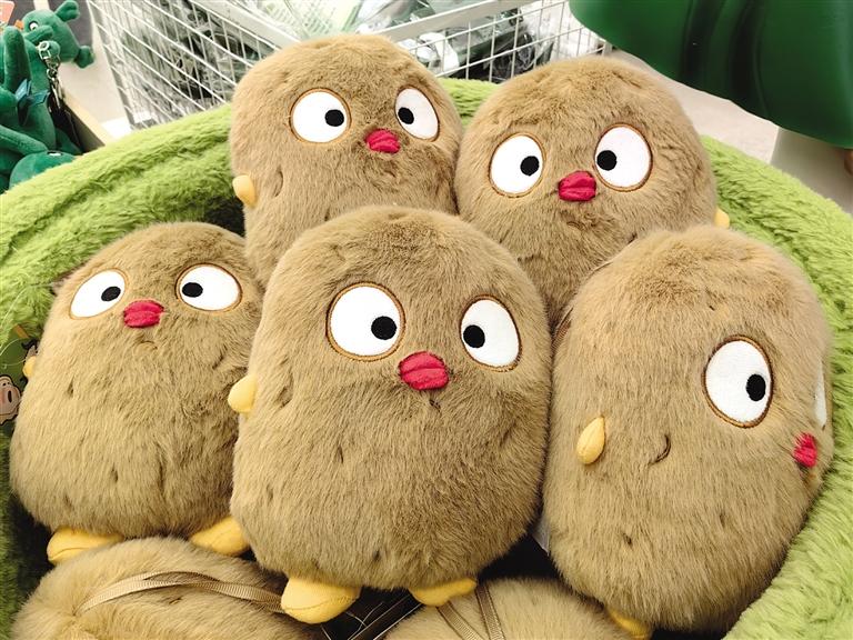 此時,目不暇接的花式文創(chuàng)在店內(nèi)“爭奇斗艷”,爭當(dāng)“顯眼包”,等待被主人帶回家。掀開店內(nèi)一只毛絨收納箱,一窩土豆子撲閃著大眼睛向你眨眼。都說轉(zhuǎn)角遇到愛,誰料,轉(zhuǎn)角處粉嘟嘟的“拿捏玩偶娃娃公仔”捏著一個小蓮花花苞在向你招手。一回頭,造型別致的文創(chuàng)飾品精美又時尚,一側(cè)的帆布包上印著“別卷我”。就連記者逛下來,都入手兩件文創(chuàng)。