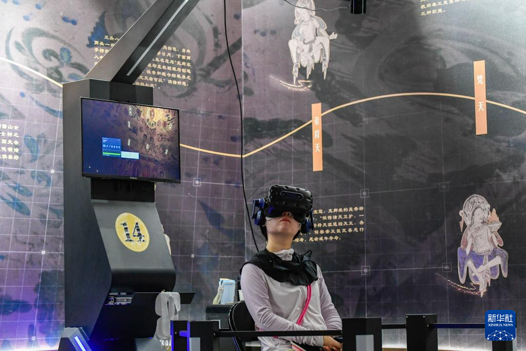 7月22日,游客借助VR設(shè)備沉浸式游覽莫高窟第285窟虛擬場景。新華社記者 郎兵兵 攝