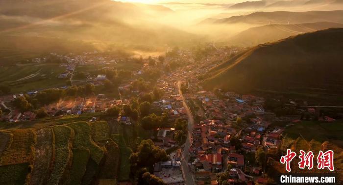 8月14日晚,蘭州市榆中縣馬坡鄉(xiāng),夕陽在云海里翻滾,映照大地和村莊城鎮(zhèn),美不勝收。圖為琥珀色黃昏。丁永睿 攝