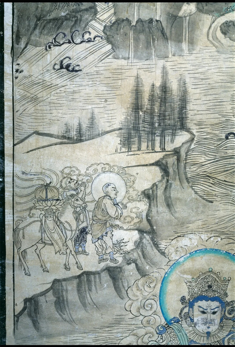 敦煌壁畫中現(xiàn)存六幅唐僧取經圖,其中時代最早、保存最完好的一幅繪于西夏時期榆林窟第3窟的《普賢變》中。此幅唐僧取經圖似是唐僧師徒在取經途中遭遇難關,誠心祈求菩薩協(xié)助渡難。圖中,唐僧身披袈裟,雙手合十,彎腰向前,遙望普賢菩薩參拜。唐僧身后,長相似猴的人雙手合十,抬頭仰望,向普賢致禮,他就是孫悟空的原型——石磐陀。師徒身后有一匹白馬,靜立等待。他們站在懸崖深壑前,面前呈現(xiàn)山窮水盡已無路的困境。