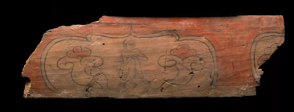 彩繪“猴”生肖木版畫,唐代,一級文物。1979年肅南縣大長嶺唐墓出土。木版畫長73厘米,寬22厘米,猴生肖木版畫呈長方形,墨筆雙線勾勒一壸門開光。壸門內墨線勾勒一猴,其雙手環(huán)抱膝蓋至胸前,猴身兩側繪有兩朵升騰祥云。壸門外飾以土紅色。