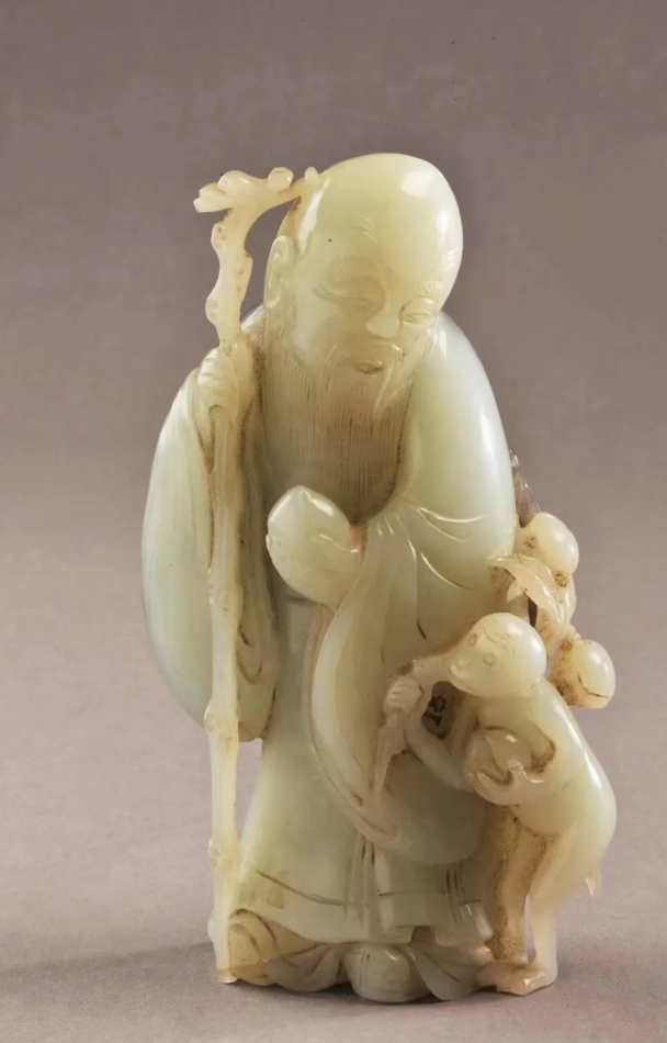 玉壽星,清代,高15.5厘米,寬9厘米,厚4.7厘米。用整塊和田青白籽料琢制,正面玉質潔白溫潤,背部有黑灰泌色。壽星頭微左傾,桃額,慈目善眉,大耳長頸,著廣袖大袍,左手持壽桃,右手持龍首杖,袍下微露云頭履。左側有一躬身站立猴子,左臂抱一壽桃,右肩扛桃枝。玉雕為俏色雕刻而成,融圓雕、線刻、透雕等手法,將壽星的慈祥和小猴子的可愛表現(xiàn)于一體。
