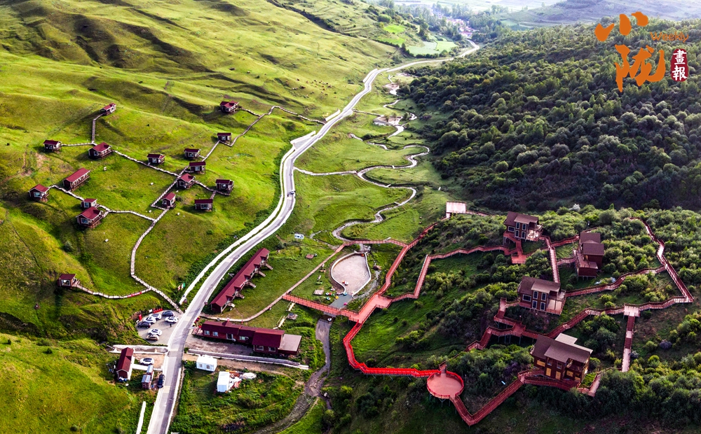 放眼望去,山峰起起伏伏,宛如鋪上了一層綠毯。山巒與草坡、森林及紅瓦白墻映入眼簾,景區(qū)道路伸向遠方。