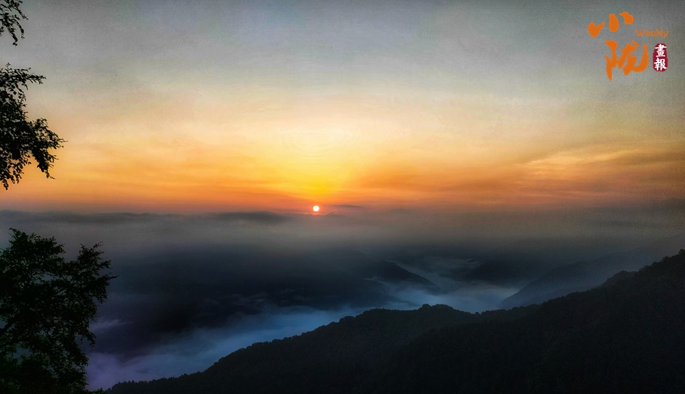 云開霧散、日照山澗,在夕陽(yáng)映照下彌漫開來的云霧像涂上了一層金黃色,大地、山川顯得格外瑰麗。