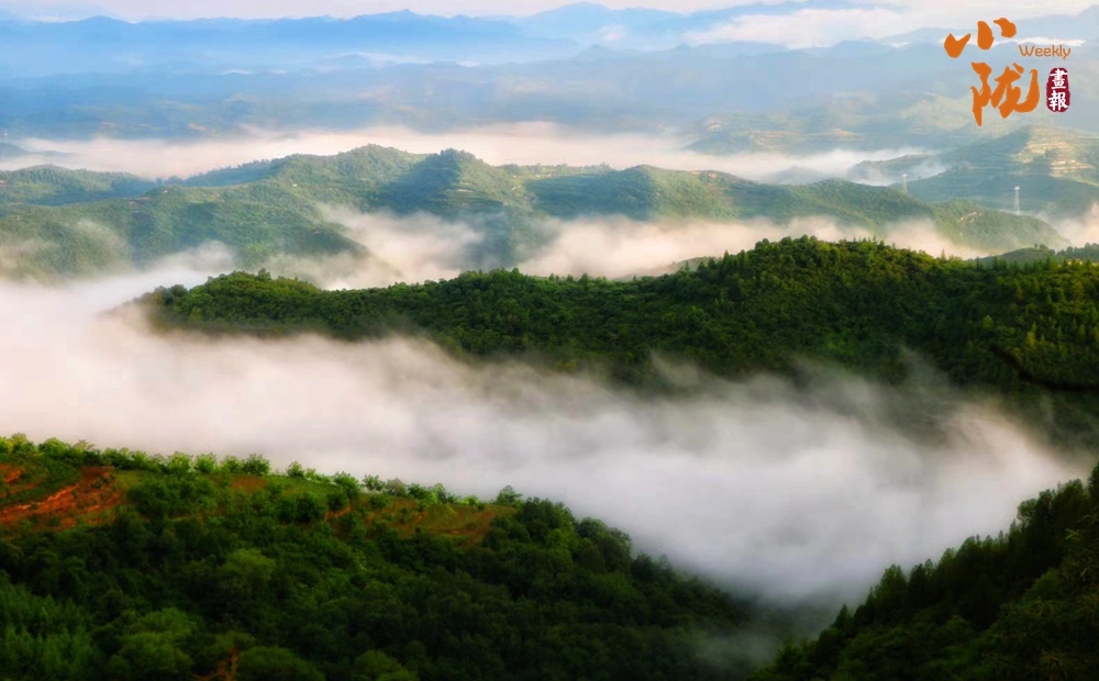 重山峻嶺間,白云如棉花般柔軟,遠(yuǎn)處的群峰在朝陽(yáng)映照和云霧的烘托下,勾勒出一幅綠色畫卷。
