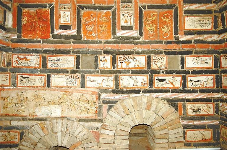 魏晉十六國(guó)磚畫(huà)在墓中的布局、組合,體現(xiàn)出 “滿”和“層”的特點(diǎn)。整個(gè)墓室,各方位、各邊角以及過(guò)道均鑲砌畫(huà)磚。以嘉峪關(guān)果園—新城5號(hào)墓畫(huà)磚的布局為例,各層間隔、同層緊鄰的畫(huà)磚,給觀者的感覺(jué)就是整幅壁畫(huà),但每一塊又是一個(gè)獨(dú)立的畫(huà)面,這種“樣式”,是魏晉十六國(guó)時(shí)期的河西匠工、畫(huà)工,在繼承漢晉磚室墓的同時(shí),將畫(huà)像磚在墓室布局的方式也加以接受。艷麗的色彩,“忠實(shí)”生活的寫(xiě)實(shí)手法,又是河西畫(huà)匠們的創(chuàng)新和發(fā)揮。