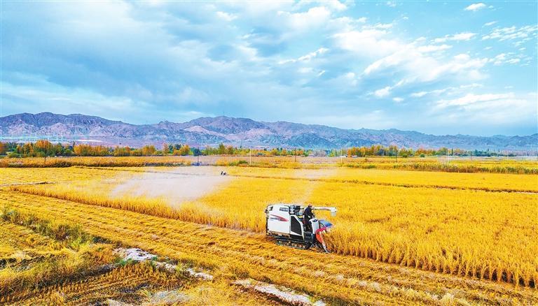 張掖市甘州區(qū)烏江鎮(zhèn)大灣村2000多畝稻田一片金黃,村民正在進行搶收作業(yè)。新甘肅·甘肅日報通訊員 楊瀟