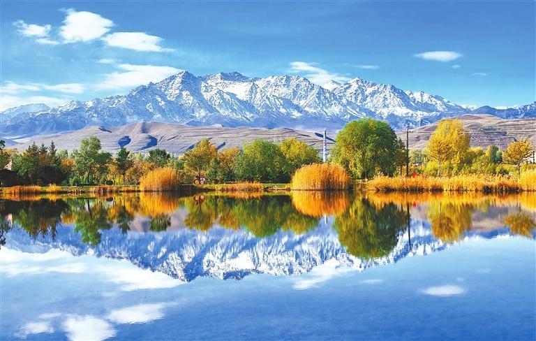 民樂縣西區(qū)公園層林盡染,在雪山的映襯下美不勝收。新甘肅·甘肅日報(bào)通訊員 王曉涇