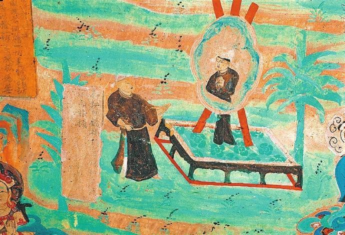 戰(zhàn)國(guó)時(shí)期楚國(guó)詩(shī)人屈原在《漁父》一文中寫道:“吾聞之,新沐者必彈冠,新浴者必振衣。安能以身之察察,受物之汶汶者乎?”意思是說(shuō)我聽說(shuō)剛洗過(guò)頭的人一定會(huì)去彈彈帽子上的灰塵;剛洗過(guò)澡的人一定要抖抖衣服的灰塵。怎能讓清白的身體去接觸世俗塵埃的污染呢?當(dāng)年的敦煌人走出溫泉,在身心放松之后,就該靜觀返照自己了。在莫高窟第85窟中有一幅“曲花式鏡圖”:畫面上在一個(gè)正方形鏤空的底座上擺放著一個(gè)巨大的曲花式鏡,鏡子式樣別致,明亮澄澈。藍(lán)色的曲花式樣引人矚目。但畫面上最吸睛的是一位魁梧俊朗身著一襲赭色長(zhǎng)袍的男子,他正在鏡子前仔細(xì)地打量自己,而鏡中映射出他神情凝重的情態(tài)來(lái)。原來(lái),古人照鏡除了正衣冠之外,還有反觀自照的含義,在鏡子前良久地注視自己,就是對(duì)自己反省、頓悟的過(guò)程。“一年好景君須記”,走過(guò)四季,到了歲末,該是每個(gè)人回望來(lái)時(shí)路,展望前方的時(shí)候了。