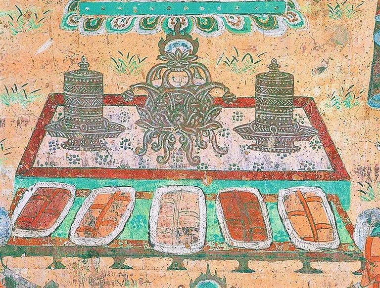 古人會(huì)在一年的歲末舉行一次集體聚會(huì),稱作“建福”。在敦煌文獻(xiàn)《社司轉(zhuǎn)帖》中寫道:“右緣常年建福一日,人各爐餅壹雙,凈粟壹斗。幸請(qǐng)諸公等,帖至限今月廿二日卯時(shí)于安家酒店取齊。”意思是說(shuō),只要有可能,每年到了年末大家都要選擇一日來(lái)進(jìn)行建福。每家每戶需要按時(shí)把準(zhǔn)備建福的物資送過(guò)來(lái)。唐朝詩(shī)人李白在《客中行》一詩(shī)中寫道:“蘭陵美酒郁金香,玉碗盛來(lái)琥珀光。但使主人能醉客,不知何處是他鄉(xiāng)。”意思是說(shuō)蘭陵美酒甘醇甜美,就像郁金香一樣芬芳四溢。興來(lái)盛滿玉碗,泛出琥珀光晶瑩迷人。主人端出如此好酒,定能醉倒他鄉(xiāng)之客。飲酒之后哪能分清故鄉(xiāng)與他鄉(xiāng)呢?歲暮聚飲蘊(yùn)含有辭舊迎新、攘兇納吉的美好愿望。在莫高窟第12窟壁畫中有一幅“帳篷酒肆圖”:畫面中圍坐在條形長(zhǎng)桌兩邊正盡興暢飲的客人為七人,還有兩個(gè)熱情忙碌的服務(wù)人員。整個(gè)畫面是一幅酒酣耳熱、興致高昂的歡飲圖。更為氣勢(shì)恢宏、熱鬧非凡的是莫高窟第23窟壁畫中一幅“院落圖”:畫面中分院落之內(nèi)與院落之外兩個(gè)部分,院落之內(nèi)是世俗的世界,畫面上布局著鱗次櫛比的廳堂房屋,有人正在庖廚、有人正在對(duì)弈、有人正在暢聊、有人正在團(tuán)聚,也有人正在說(shuō)教,總之表現(xiàn)的是我們?nèi)粘I畹陌賾B(tài)。院落之外是佛國(guó)世界,整體呈現(xiàn)出肅穆莊嚴(yán)之感。有趣的是在佛國(guó)與世俗世界中間,畫的是服飾艷麗,騎馬遠(yuǎn)行的人們。