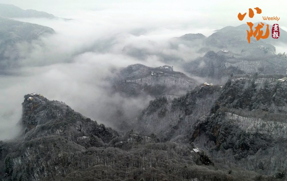 古建筑群在山雪映襯下,更顯古樸、神秘,常青樹木為冬日增添了生機(jī)。