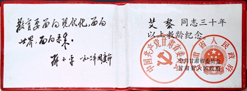 這是一本從教滿三十年的榮譽(yù)證書(shū)。由中共甘肅省委、甘肅省人民政府頒發(fā)。證書(shū)內(nèi)頁(yè)的左側(cè)是鄧小平1983年國(guó)慶節(jié)題寫(xiě)的“教育要面向現(xiàn)代化,面向世界,面向未來(lái)”。右側(cè)是“艾黎同志三十年以上教齡紀(jì)念”。“三個(gè)面向”是為北京景山學(xué)校的題詞,是鄧小平提出的教育發(fā)展改革方針,旨在推動(dòng)中國(guó)的教育現(xiàn)代化進(jìn)程,使其更加開(kāi)放和適應(yīng)未來(lái)發(fā)展的需要,面向世界,吸收國(guó)際先進(jìn)的教育理念和經(jīng)驗(yàn);同時(shí)展望未來(lái),培養(yǎng)適應(yīng)未來(lái)社會(huì)需要的人才。