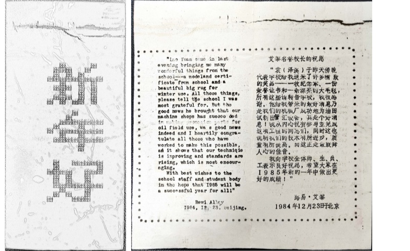 證書(shū)是由石油工業(yè)部培黎石油技校申報(bào)的。1984年12月30日,培黎石油技校自制的新年賀卡內(nèi)頁(yè)用中英文印上了名譽(yù)校長(zhǎng)艾黎的祝愿: