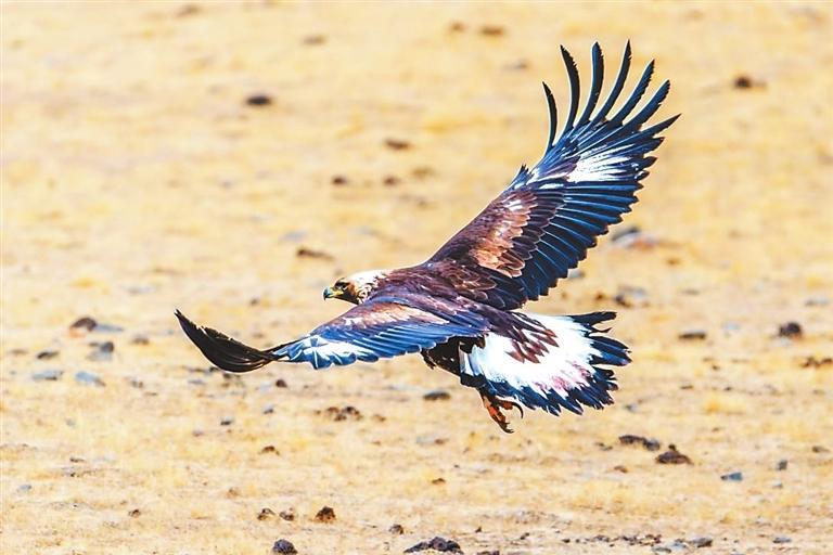 金雕以其卓越的捕獵技巧和優(yōu)雅的飛行姿態(tài)而聞名,主要棲息于高山草原、森林及河谷地帶。在祁連山遼闊的草原之上,金雕展開它那寬闊且有力的雙翅,在藍(lán)天之中肆意翱翔。陽光傾灑下來,深褐色的羽毛閃爍著如同金屬般耀眼的光澤,猶如披上了一件堅(jiān)不可摧的鎧甲,威風(fēng)凜凜。它那犀利的眼神,仿佛能夠穿透重重迷霧,洞察這片廣袤土地上的每一個細(xì)微變化,盡顯王者風(fēng)范。它身姿雄偉而威嚴(yán),宛如一位至高無上的王者,向整個世界展示著它那不容小覷的力量與威嚴(yán),默默地守護(hù)著這片廣袤無垠的草原天地。