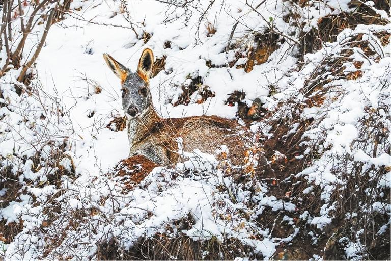 攝影師鏡頭下,一只馬麝安然臥在雪地上,它的耳朵偶爾會輕輕抖動一下,像是在用心傾聽著風(fēng)中傳來的細(xì)微聲響。它優(yōu)美的身形與周圍的景色完美融合在一起,寧靜而祥和。