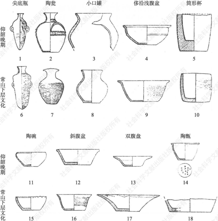 常山下層文化遺存雖發(fā)現(xiàn)較早,但長期被誤認作齊家文化或客省莊二期文化。1979年秋,隨著常山遺址發(fā)掘工作的推進,發(fā)現(xiàn)它與齊家文化聯(lián)系緊密,與客省莊第二期文化、廟底溝二期文化有相同或相似之處,可是,它們各自文化性質是不相同的。胡謙盈先生認為分布在寧夏南部和隴山東西兩側,涇渭兩河等地區(qū)命名的齊家文化其實是屬于客省莊二期文化和常山下層文化遺存。經碳14測定,常山下層文化年代約為公元前2930±180年(樹輪校正年代),廟底溝二期文化(約公元前2700 - 前2400年),陜西客省莊第二期文化(約公元前2400 -前2000年),甘肅齊家文化(約公元前2200 - 前1600年),常山下層文化比后兩者原始文化分別早七、八百年。為將常山遺址作為獨特文化典型深入研究,避免名稱限制對其與其他文化關系的探討,胡謙盈先生提出“常山下層文化”這一命名,以區(qū)別于“齊家文化”或“客省莊第二期文化”,并認為它是齊家文化的重要源頭之一。
