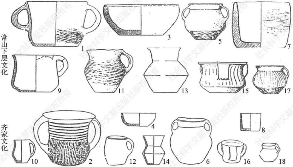 常山下層文化過去限于資料太少,對其研究進展緩慢,近年來很多學者研究有了新的突破。陶器在常山下層文化中獨具特色,橙黃色、紅褐色陶器搭配斜行籃紋,成為其顯著特征。諸多齊家文化器物,如豎行籃紋單耳罐、單耳杯、雙耳杯、侈口罐等,皆可在常山下層文化中尋得淵源,胡謙盈據(jù)此提出“常山下層文化是齊家文化的重要來源”,張忠培亦認為,常山下層文化的提出,有力推動了齊家文化淵源的研究。不過,學界對于齊家文化的起源尚存爭議,有人認為齊家文化是馬廠類型的的延續(xù)與發(fā)展,也有人認為是獨立發(fā)展而成,還有人認為是馬家窯文化發(fā)展到馬廠類型后分東西兩支,一支發(fā)展為河西的四壩文化,一支發(fā)展為齊家文化。韓建業(yè)先生認為齊家文化應當是客省莊二期文化西進隴東南并與菜園文化融合的結果,齊家文化早期的絕對年代約在公元前 2400-前 2200 年,這個時段在中國內地屬于銅石并用時代晚期,分布在天水一帶的遺存是齊家文化早期階段,常山下層文化絕對年代約在公元前2700-前2400年,相當于廟底溝二期階段,再向下就屬于齊家文化早期階段。 近年來,大多學者提出齊家文化源頭大致在隴東及寧夏南部,由東向西漸進擴展。