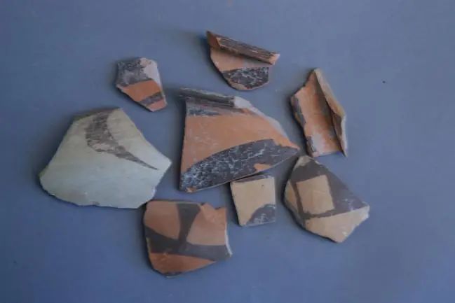 常山下層陶器的籃紋、彩陶和彩繪獨具特色?;@紋均橫行或斜行施于器壁,常見籃紋窄小且拍印深,可能是黃土高原溝壑地帶稀樹叢林藤條編織器物在陶器紋飾上的獨特反映?;@紋陶器大多器型精美且較大,如橙黃色籃紋高領深腹罐,當屬上流社會使用的器物。彩陶以赤砂石為顏料,因顏料調和濃度大且未經壓磨,棕紅色彩紋直接裸露于器皿壁面,與仰韶、馬家窯等文化彩陶著彩后壓磨光滑的工藝截然不同。彩繪所用顏料與色澤雖與彩陶相同,但彩繪施于燒制后的器皿上,極易脫落。