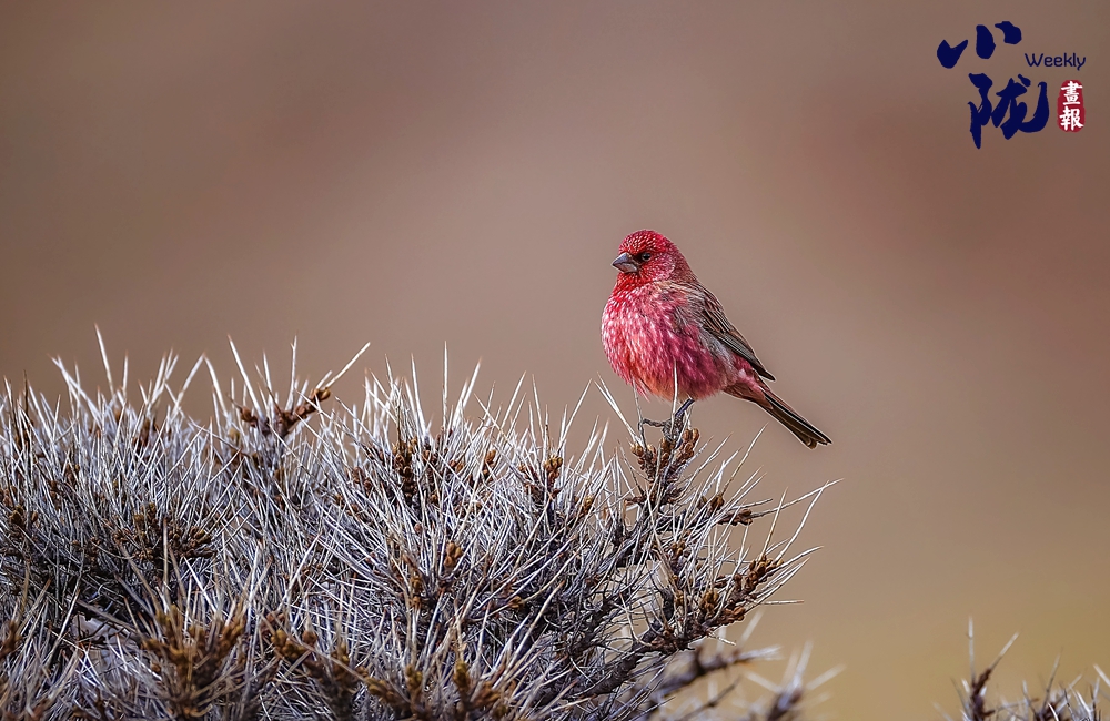 紅眉朱雀,是雀形目燕雀科朱雀屬的鳥類,中等體型,體長約為15厘米。雄鳥的特征是眉紋和臉頰呈淡紫粉色,而上體則有褐色斑駁。雌鳥沒有粉色,難稱“漂亮”,它們?nèi)砘液稚?,?ldquo;朱”一點(diǎn)也不沾邊兒,實(shí)際上,很多鳥類的雌鳥都要比雄鳥暗淡很多,這種暗淡的顏色能幫助它們在孵卵的時候更好地隱蔽,以逃過天敵的捕殺。雄鳥和雌鳥都類似于體型較小的曙紅朱雀。